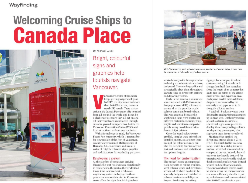 The Vancouver cruise ship season keeps getting bigger every year with over 840,000 tourists expected to arrive this year. The tourists come from around the world and, to ensure everyone gets on and off the ship, and directed through customs, ground transportation, and through the hotel & convention centre attractions without any confusion can be a challenge. However, with bright back-lit posters, strategically placed signage and clear, universal graphics produced and installed by Multigraphics, it was all smooth sailing for the Port of Vancouver.